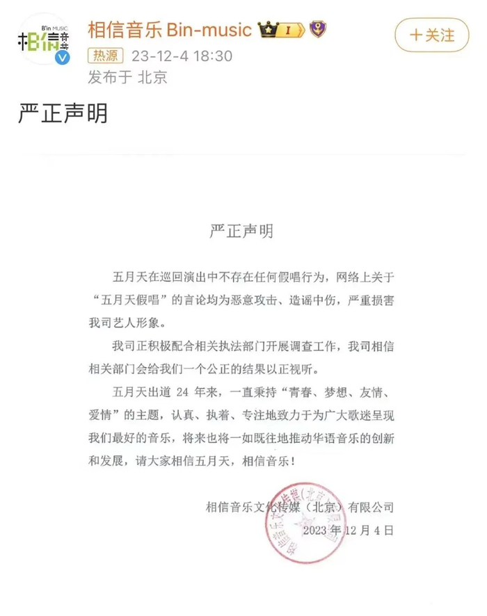 五月天经纪公司发了声明,说不存在假唱。