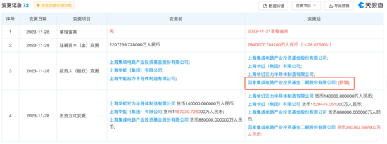 天眼查APP显示,近日,上海华力微电子有限公司发生工商变更,新增国家集成电路产业投资基金二期股份有限公司(以下简称“大基金二期”)为股东,同时,公司注册资本由约220.7亿元人民币增至约284亿元人民币,大基金二期持股占比为10.2374%。