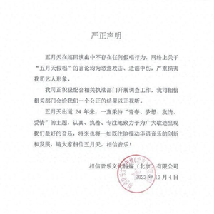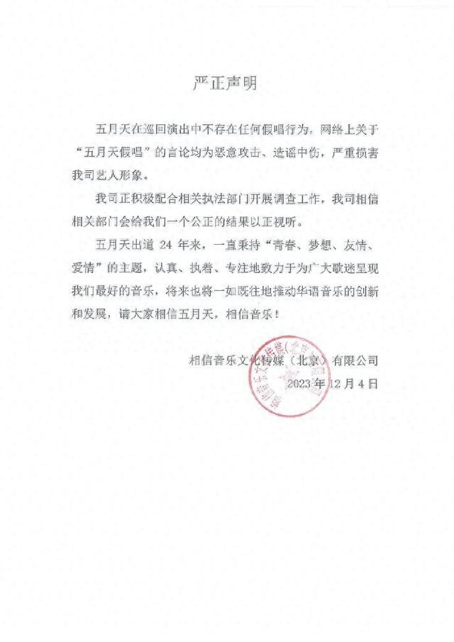 12月4日,五月天经纪公司@相信音乐Bin-music 发布声明称,五月天在巡回演出中不存在任何假唱行为,网络上关于“五月天假唱”的言论均为恶意攻击、造谣中伤,严重损害艺人形象。公司正积极配合相关执法部门开展调查工作。