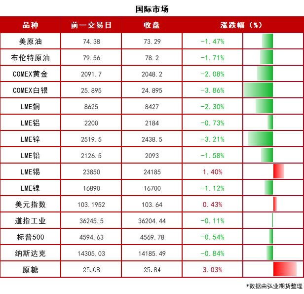 国际贵金属期货普遍收跌,COMEX黄金期货跌1.99%报2048.2美元/盎司,COMEX白银期货跌3.72%报24.895美元/盎司。美国10月工厂订单环比降3.6%,为2020年4月以来新低,预期降2.6%,前值由升2.8%修正至升2.3%。市场对于三月降息的预期小幅回落,短线贵金属波动较大,宽幅震荡判断。