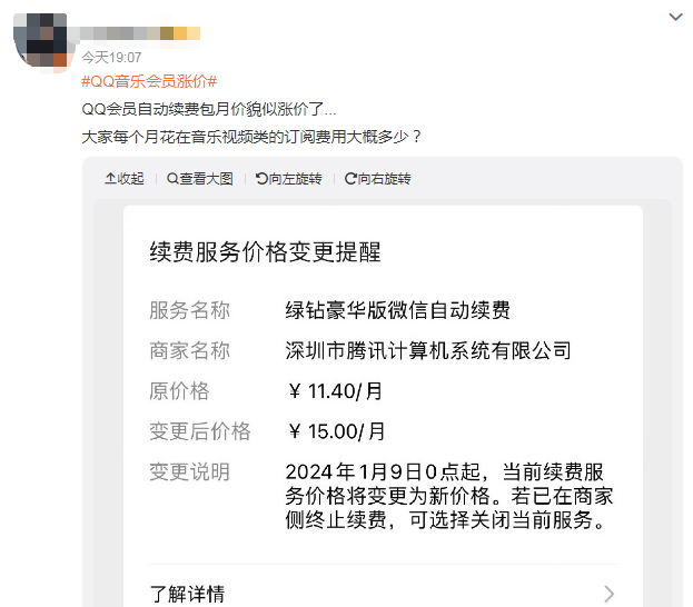 12月4日,有网友发文称,QQ 音乐日前向微信用户发送“续费服务价格变更提醒”:2024年1月9日0点起,绿钻豪华版微信自动续费的费用将从 11.4元/月变更至 15元/月。