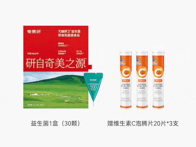 在特惠期间,购买奇美研无幽舒卫益生菌1盒(30袋),赠送3支维生素C泡腾片。