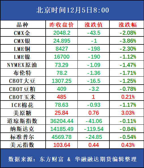 12月4日国内不锈钢现货具体报价如下:天管、酒钢304/2B冷轧主流切边报价14000-14300元/吨,张浦报14100-14800元/吨,民营钢厂宏旺、甬金毛边基价报13700-14000元/吨,报价较上一日跌100元/吨,对2401合约平均基差350(-25)。高镍铁主流成交价950(+0)元/镍,出厂含税;高碳铬铁报价主流报8550(-0)元/50基吨(数据来源:Mysteel)。上期所注册仓单量56905吨(-296吨)。