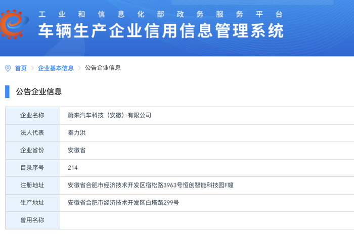 目录中的蔚来汽车科技(安徽)有限公司位于合肥经济技术开发区,法人代表为蔚来汽车联合创始人、总裁秦力洪。国家企业信用信息公示系统显示,上述公司登记的经营范围包括为汽车行业新产品及元器件的研究、开发、检测及相关技术配套服务、汽车及配件、汽车用品销售等业务,尚未包含汽车制造。