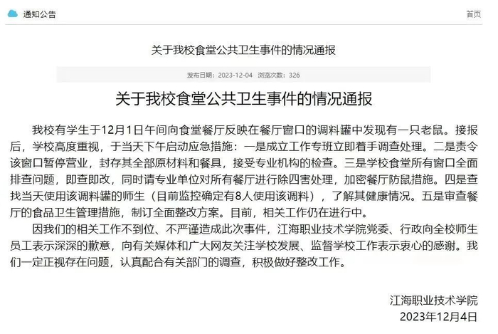 ●近日,有网友在社交媒体爆料称,在江苏扬州江海职业技术学院食堂的麻酱盆中发现老鼠,引发关注。12月4日,江海职业技术学院发布关于学校食堂公共卫生事件的情况通报。