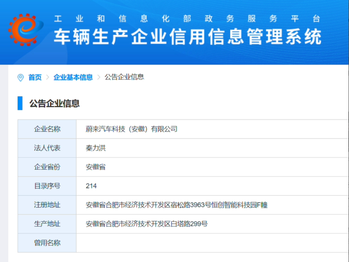● 12月4日,据工信部网站显示,蔚来出现在“车辆生产企业信用信息管理系统”中,此信息表示蔚来已获得独立生产资质。