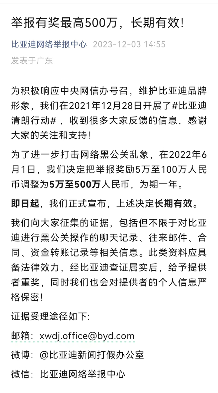 ● 12月3日,比亚迪网络举报中心发文表示:“为了进一步打击网络黑公关乱象,在2022年6月1日,我们决定把举报奖励5万至100万人民币调整为5万至500万人民币,为期一年。即日起,我们正式宣布,上述决定长期有效。”