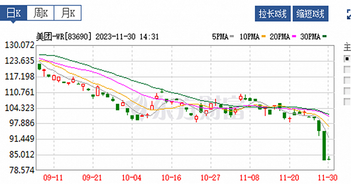 由此可见,第三季度美团增长还是比较迅猛的。然而,财报发布之后,11月29日,港股美团开盘大跌7.72%,随后两天股价继续下探至2020年4月以来的低点78.45元,总市值约5489亿港元。二级市场对此显然不买账。