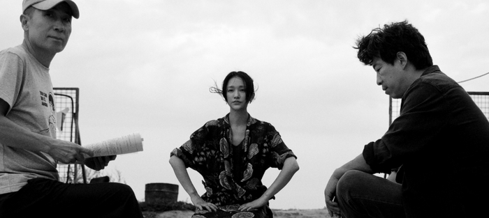 ·周迅与导演曹保平(左)、演员黄渤在《涉过愤怒的海》拍摄现场。