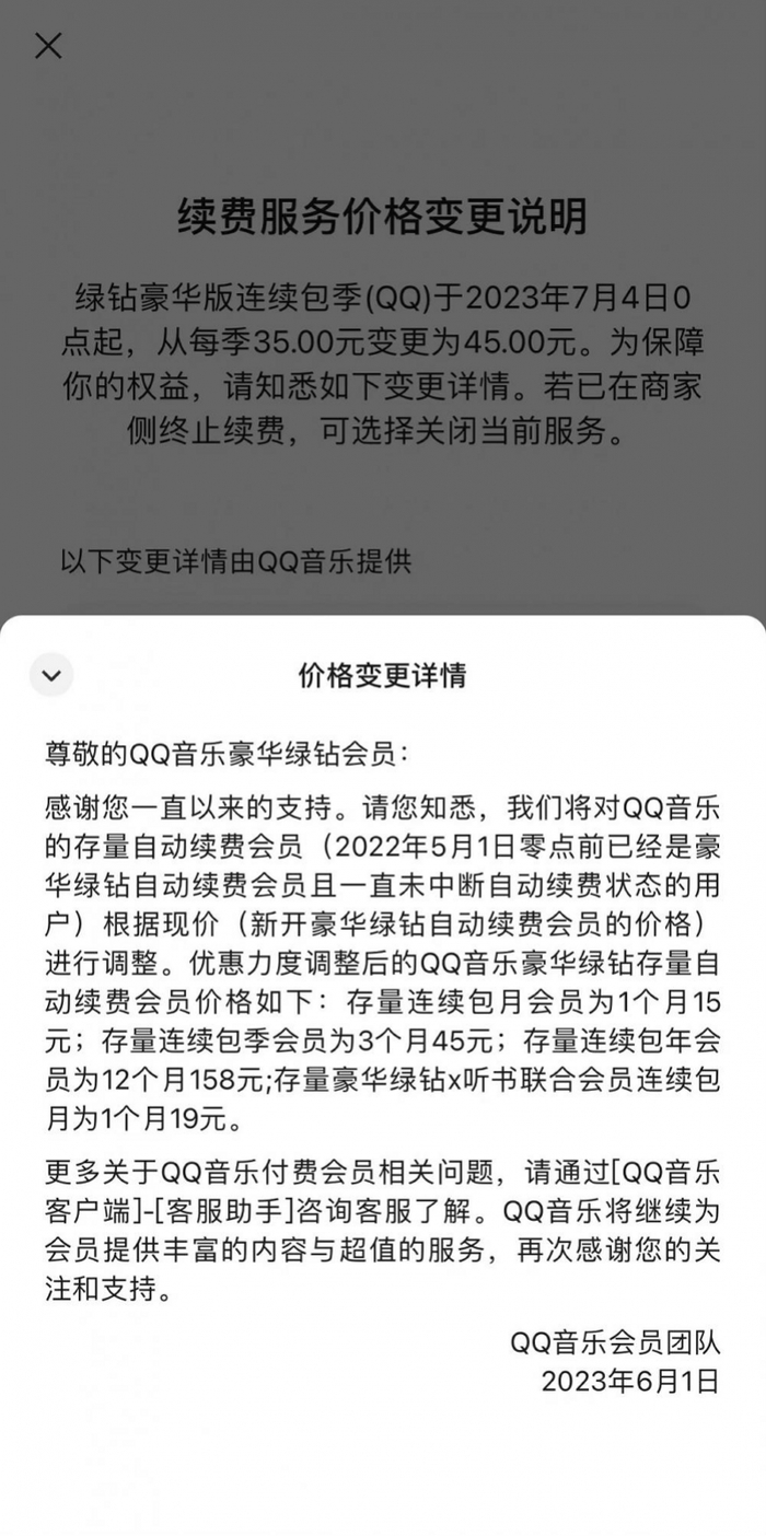 据此前媒体报道,今年6月,QQ音乐在APP内发布公告,将对豪华绿钻会员中的存量自动续费会员进行价格调整。