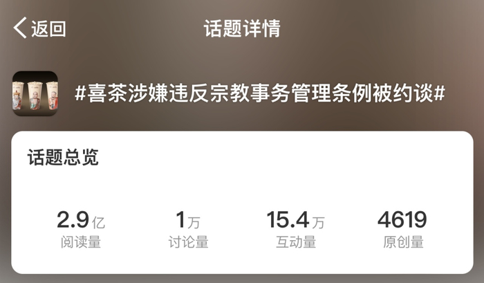 根据澎湃新闻报道,《宗教事务管理条例》《关于进一步治理佛教道教商业化问题的若干意见》(国宗发〔2017〕88号)《互联网宗教信息服务管理办法》等明确规定,禁止以宗教名义进行商业宣传。12月4日,深圳市民族宗教事务局工作人员反馈称,该局于12月1日约谈了喜茶公司,喜茶于12月3日做了下架处理,同时就相关情况作出检查。