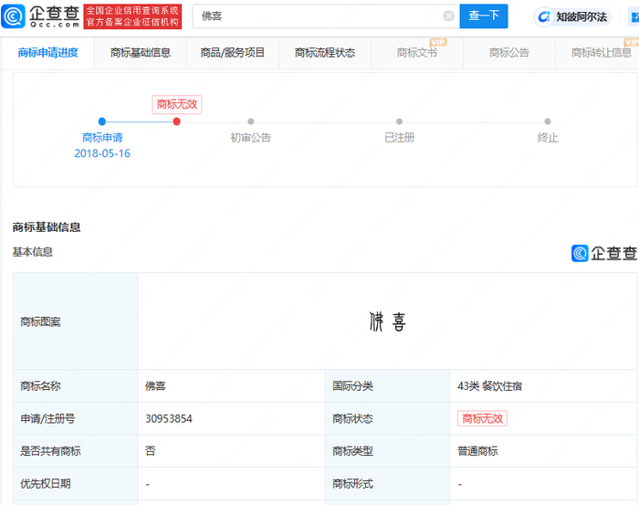 另外,企查查APP显示,“佛喜”曾被多方申请注册商标,申请人包括北京某信息技术公司、自然人侯某某,国际分类包括餐饮住宿、珠宝钟表,目前,这些商标均已被驳回,处于无效状态。