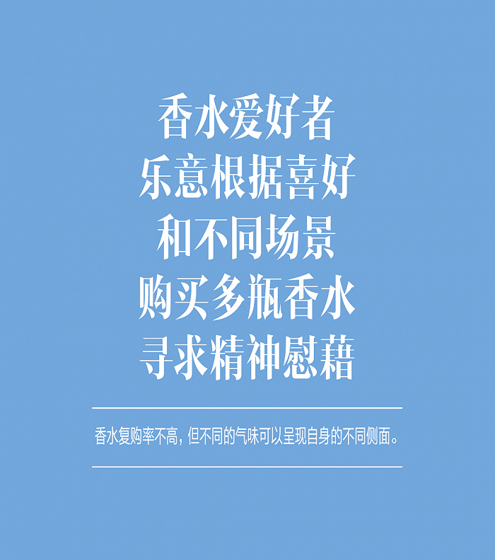 尽管香水这一品类复购率不高,但多数香水爱好者却乐意根据喜好和不同场景购买多瓶香水,从不同的气味中寻求精神慰藉,呈现自身的不同侧面。