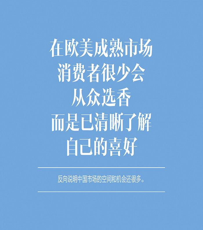 “在欧美成熟市场就不存在‘街香’这个概念,消费者很少会从众选香,而是已清晰了解自己的喜好,在丰富的香水产品中选择代表自己的味道,而非选择品牌或追逐热门。”该人士认为,这正好反向说明中国市场的空间和机会还很多。