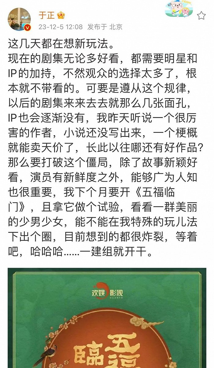 至于前置炒作,于正似乎也痛定思痛,要用“特殊的玩儿法”让新剧《五福临门》“广为人知”,打算“一建组就开干”。