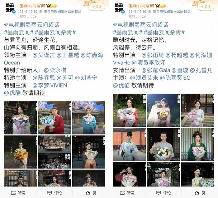 除此之外,如今也是一个剧集炒作无限前置的时代。以于正剧的妆造,过去如果有路透出圈,往往是因为猎奇,无法带来正面的买股效应。郭敬明则大步跟上了路透时代,《云之羽》从古偶101中脱颖而出,不止是因为“长生花”二搭,也是因为妆造与路透打了一手好配合,不断挑高外界期待值。