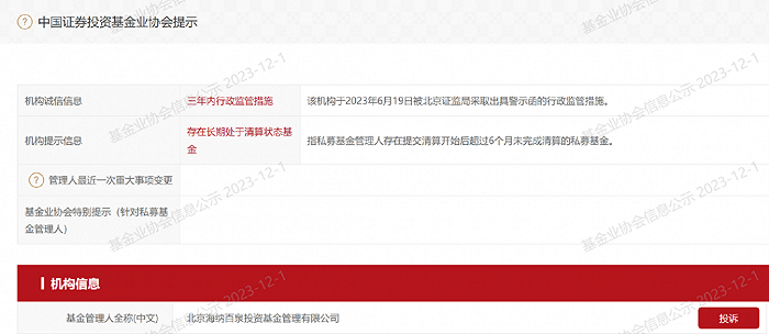 此外,中基协机构提示信息显示,海泉基金当前存在长期处于清算状态。