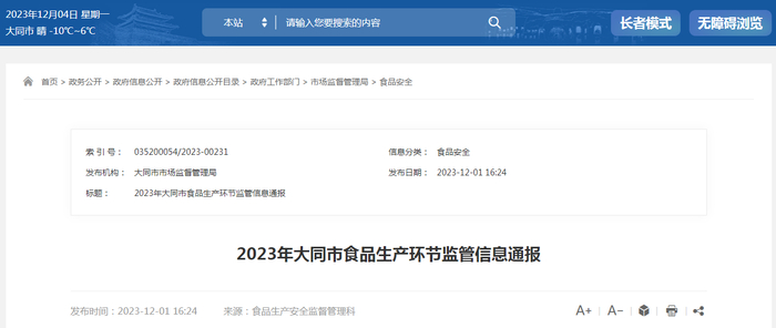 根据《中华人民共和国食品安全法》及其实施条例、《食品生产经营风险分级管理办法》、《食品生产经营监督检查管理办法》等法律法规的要求,大同市市场监督管理局对辖区范围内的200家食品生产企业参照其“食品生产许可证”获证明细中风险等级最高食品类别、静态风险分值、动态风险分值、通用信用风险分值等因素,调整确定了企业风险总分值,其中A级29家、B级75家、C级41家、D级55家。