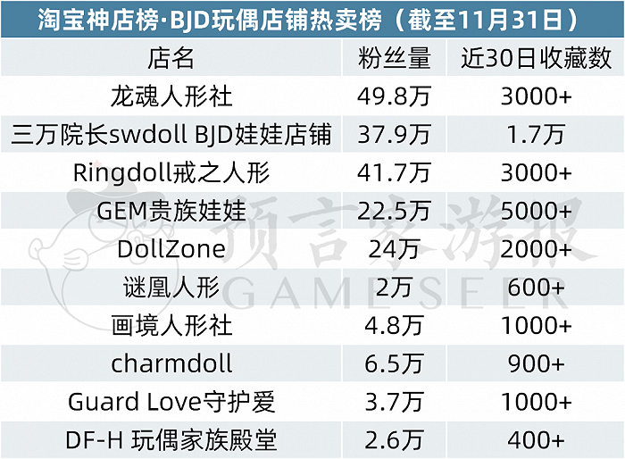 其余店铺排名有轻微浮动,分别为三万院长swdoll BJD娃娃店铺、Ringdoll戒之人形、GEM贵族娃娃、DollZone、谜凰人形、画境人形社、charmdoll、Guard Love守护爱、DF-H 玩偶家族殿堂,其中谜凰人形、Guard Love守护爱、DF-H 玩偶家族殿堂是榜单新面孔。