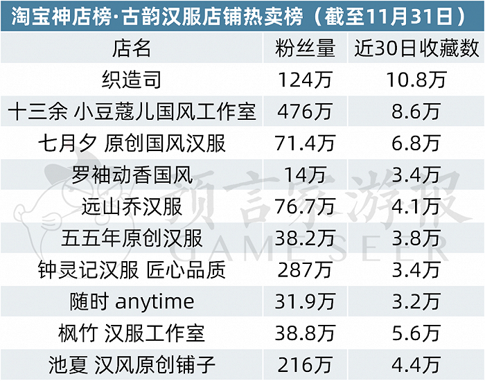 其余入榜店铺分别为七月夕 原创国风汉服、罗袖动香国风、五五年原创汉服、钟灵记汉服 匠心品质、随时 anytime、枫竹 汉服工作室。