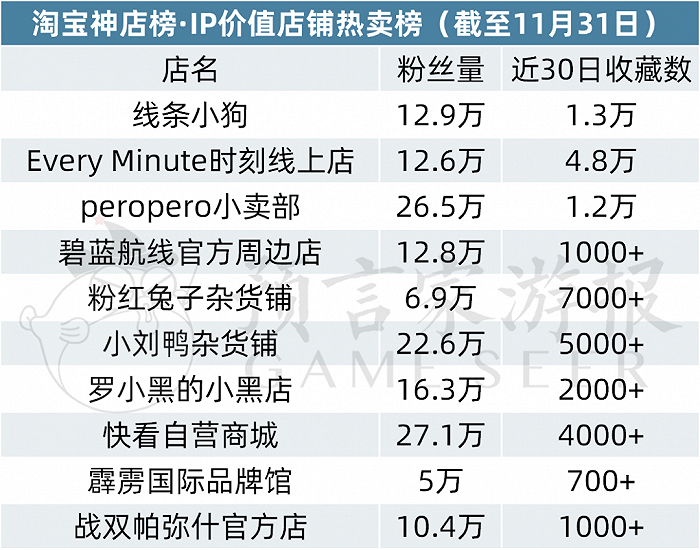 游戏IP本月空降两位,为碧蓝航线官方周边店和战双帕弥什官方店,都是二次元常青手游,粉丝基数稳定。