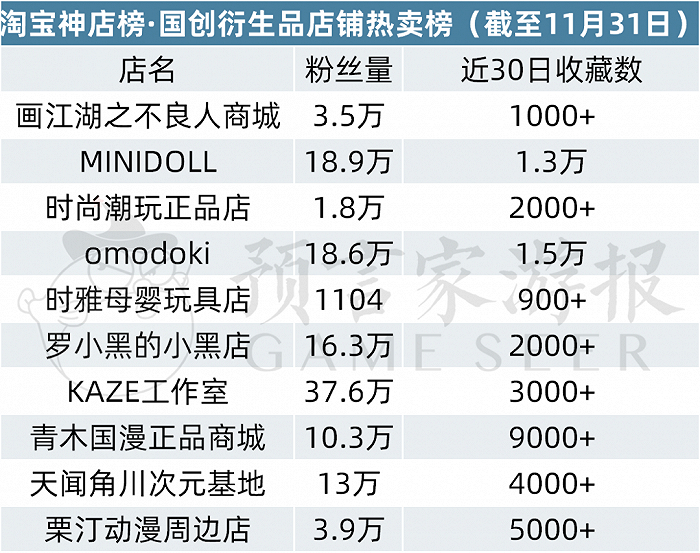MINIDOLL和时尚潮玩正品店位于榜单第二和第三,omodoki新入国创衍生品店铺热卖榜,拿下第四的位置。