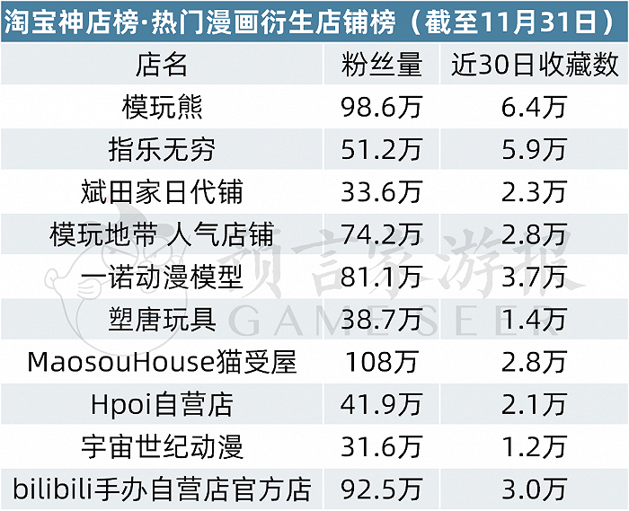本月漫画衍生店铺榜单前三仍旧不变,模玩熊、指乐无穷、斌田家日代铺稳居前三名。模玩熊月新增粉丝数3.3万,预估会在年底突破百万粉丝数。