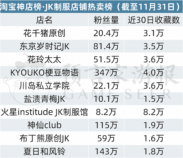 从第三名到第十名分别是花玲太太、KYOUKO梗豆物语、川岛私立学院、盐渍青梅JK、火星institude JK制服馆、神仙club、布丁熊原创JK、夏日和风铃。