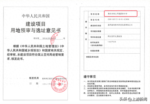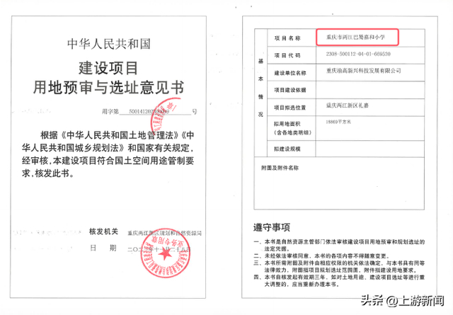 11月29日,笔者获悉,重庆两江新区规划和自然资源局已经批复关于“两江巴蜀嘉和小学、两江巴蜀嘉和中学”两所学校的建设项目用地预审与选址意见书。意见书的附件对总体规划条件、地块规划条件等进行了说明。