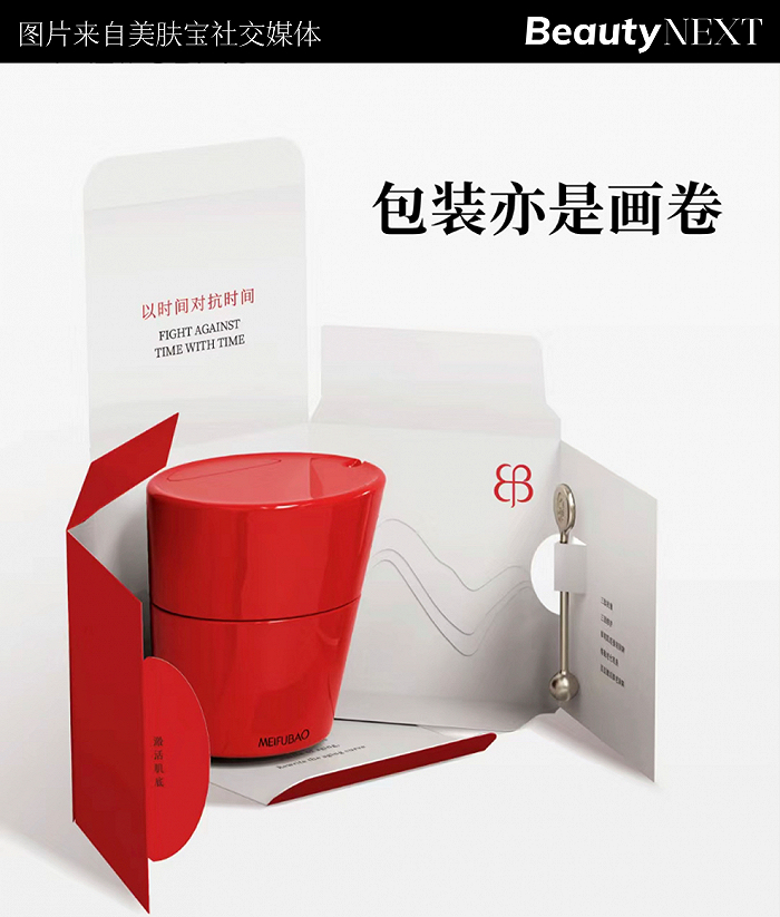 美肤宝的新品则通体运用了品牌的红色,以一种非常规的瓶身线条设计,呼应“反重力”的概念,定制珠棒配上品牌logo,则有一种东方美感与中式韵味。
