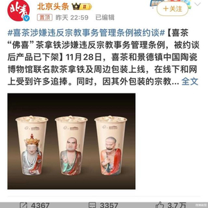 向来爱联名的喜茶,这次可能真的要说一声“无语”。12月4日,#喜茶涉嫌违反宗教事务管理条例被约谈# 一话题登上热搜,根据澎湃新闻,喜茶和景德镇中国陶瓷博物馆联名款“佛喜”茶拿铁在线下和网上受到许多追捧的同时,因其外包装的宗教元素,也遭到众多批评。