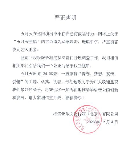 12月1日,博主“声理学”表示以微薄之力,向中国消费者协会举报五月天公然假唱。“声理学”称,五月天在个人演唱会公然假唱的行为,严重侵犯了消费者权益,理应承担赔偿,以及承担相关法律责任。希望相关部门能够彻查到底,给予公众尤其是消费者一个公道。目前,已有两部门表示针对上述事件展开调查。对此,五月天经纪公司于4日晚间发布声明否认“假唱”。