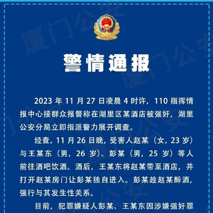 12月5日,潮新闻记者联系上了发帖网友,该网友提供了一张相关内容的截图。截图内容显示,11月27日4时42分,110接群众报在湖里区高林中路水晶桔子公寓被强奸。指令金山所、湖里刑大到场处置。经查,系赵某(女,23 岁,某校大四学生)于26日22时许与朋友王某(男26岁,厦门人)、彭某 (男,25 岁,厦门人)、洪某某 (男,32岁,厦门人)一起喝酒,3人均为厦门外国语学校翔安附属学校老师。4人先后在滨北梦田酒吧、SK酒吧饮酒至27日2时许。王某带赵某先行离开到水晶桔子公寓开房,欲与赵某强行发生性关系被拒绝,王某放弃离开。3时许,3人碰面时,王某称赵某不愿与其发生关系,彭某表示喝酒时赵某与其互动亲密,要前去试探能否与其发生性关系。后3人返回酒店,王某用手机扫码开门,让彭某进入房间,自己和洪某某在房间外等候。彭某趁赵某醉酒无意识与其发生性关系后离开现场。现嫌疑人均已到案,刑大已立强奸案侦办,拟对彭某、王某采取刑事拘留强制措施。