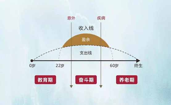 草帽图中的两条曲线将生命周期分为三个阶段:①教育期,我们在父母的庇护下无忧无虑地成长,几乎所有的日常花销和教育支出都由父母承担;②奋斗期,我们为追求美好生活努力奋斗,同时也更多地承担起买房、买车、成家、立业、子女教育、赡养父母等的家庭责任,是积累人生财富的黄金时期;③养老期,随着年龄增长和劳动力下降,我们逐步退出工作岗位,面临收入减少和看病就医费用的增加,需要不断消耗前期的人生财富来维持原有的生活质量。