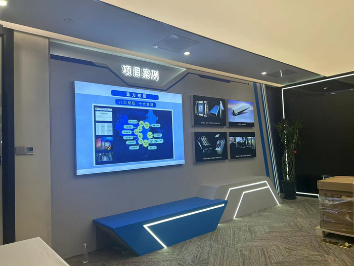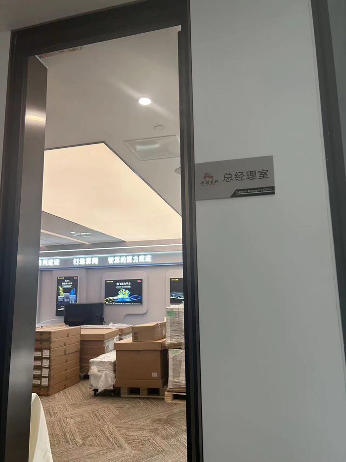 据记者观察,现场办公人员较少,显得较为冷清,标有“麒麟数科”字样的公司总经理室内堆放了不少货物,公司人员解释是“算力方面的东西”,公司内部亦有多处算力、算网相关的宣传介绍。