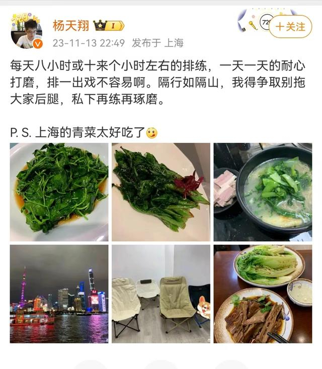 在北京长大的杨天翔笑言,来到南方等于过年,“在上海,我也不在乎伙食费了。”他曾在微博赞扬,“上海的青菜太好吃了。”