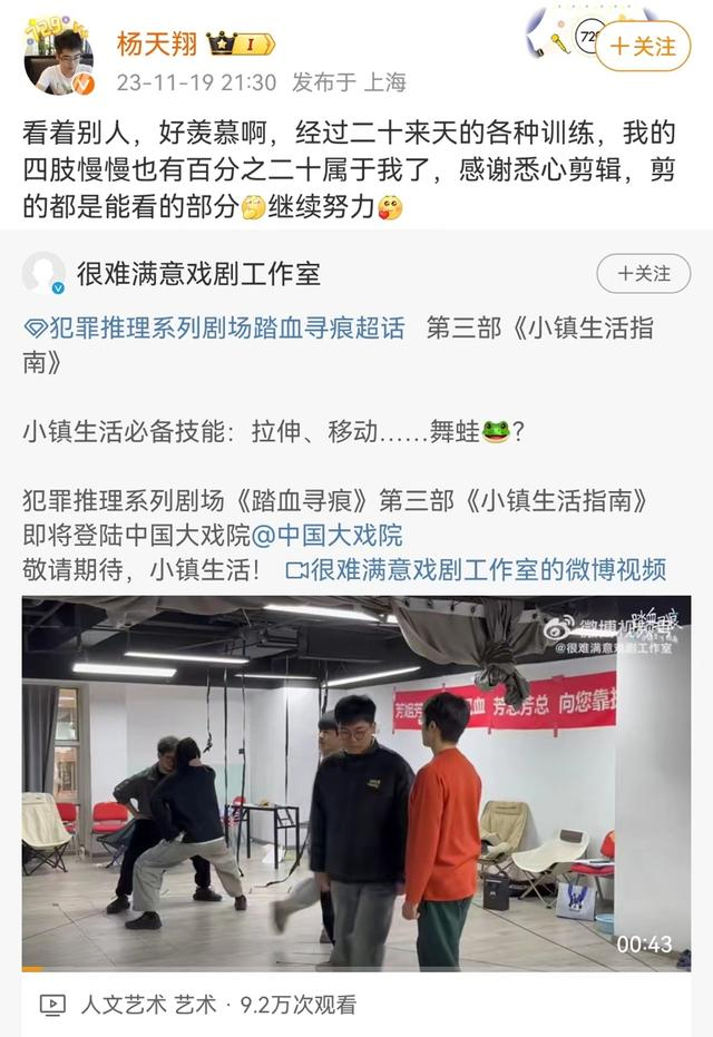 11月,杨天翔从北京来到上海,他把一个月留给《踏血寻痕之小镇生活指南》。排练时,杨天翔发微博,自嘲“四肢慢慢也有20%属于我了。”