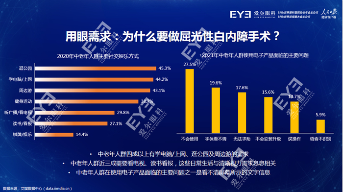 从用眼需求看,在中老年群体主要社交娱乐方式中,超四成有学电脑、上网、逛公园及周边游的需求,近三成需要看电视、读书看报等。而中老年群体有近两成在使用电子产品时看不清屏幕信息。另据相关数据统计,65岁以上老人30%曾有跌倒经历,80岁以上老人40%至50%曾有跌倒经历。视力下降、视物模糊不仅影响中老年人的社交娱乐,更严重影响他们的身体健康!