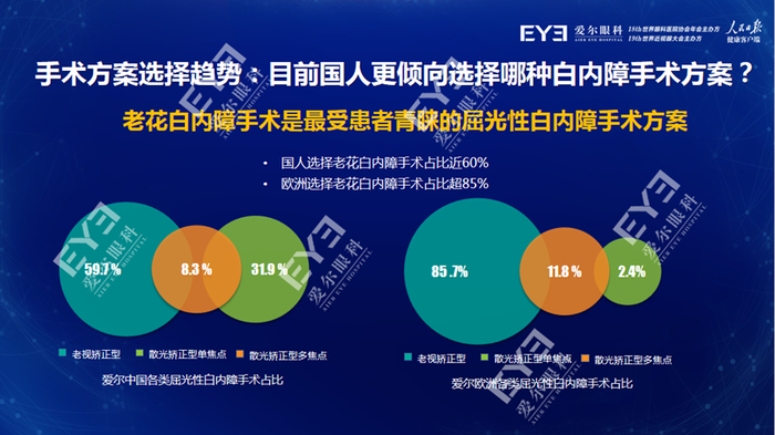 从术式选择来看,老花白内障手术是最受患者青睐的屈光性白内障手术方案,中国选择老花白内障手术的占比近60%,欧洲选择老花白内障手术占比超85%。“老花白内障手术在解决白内障问题的同时还能解决老花眼问题,能为患者提供更好的远、中、近全程视力,手术后不再需要佩戴老花镜,因此得到不少摘镜需求强烈的中老年人的青睐。”中国医师协会眼科医师分会常委、爱尔眼科医院集团白内障学组组长、爱尔眼科医院集团辽宁省区总院长张劲松教授说道。