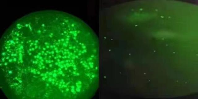 在荧光显微镜下,健康的卵巢组织(左图)内,鲜活的卵泡像萤火虫的微光星星点点,衰竭的卵巢组织(右图)内则是一片暗淡。 受访者供图