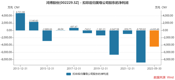 多年以来,鸿博股份业绩处于亏损状态。自2018年至2023年前三季度,公司扣非后归母净利润在持续亏损,累积亏损2.29亿元。近两年归母净利润也出现亏损,今年前三季度亏损3,229.12万元。