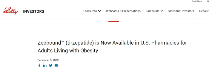 礼来表示,有医生处方的患者现在可以获得Zepbound,这种药物本月被添加到了快捷药方公司和信诺医疗保健公司的可选药物清单中。并将继续投资扩大其产量,以满足患者对创新药物的需求,让数百万美国人能够使用Zepbound。