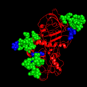 蛋白质(红色)与聚糖(蓝色和绿色)结合糖基化。