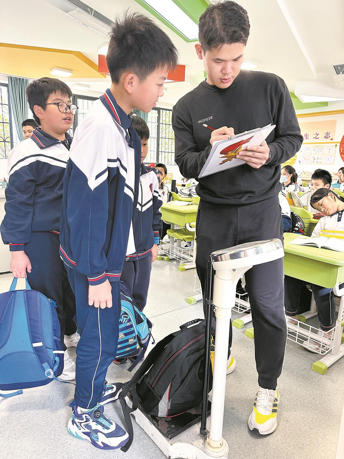 行动开始前,老师们首先做了调研,在6个年级分别抽查了一个班的书包重量,发现每个班都有五成以上学生的书包重量超过该学生体重的10%。“一年级某班1名女生书包重量达11斤,16名学生的书包重量在8斤至10斤之间。六年级某班学生的书包平均重量是12斤,12名学生的书包达14斤。”海实副校长张琳介绍。根据国家卫健委发布的“中国青少年身高体重标准表”,7岁孩子的标准体重是48斤、12岁标准体重是85斤。也就是说,大多数孩子的书包重量远远超过了体重的10%。