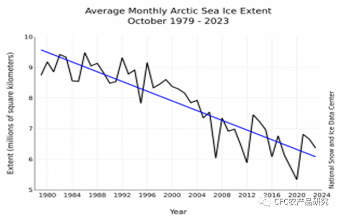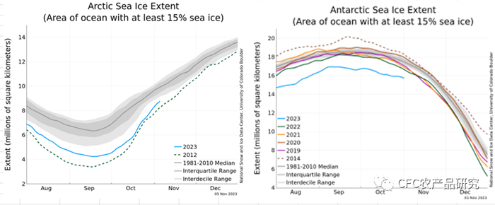 北极和南极海洋,2023年10月的平均北极海冰面积是1979年以来第七低的同期水平,南极海冰范围保持在历史最低水平。