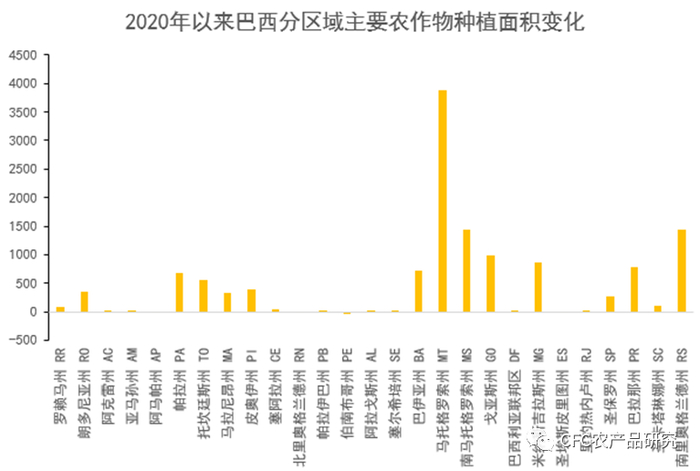 最近3年巴西的主要农作物种植面积增加了12%,或1290万公顷,面积的主要增长位于巴西中北部,中部和南部区域。