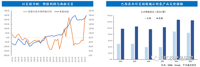 2024年是巴西农业全面在贸易体量上雄据全球的一年,而巴西农业的低成本,尤其是地租的低成本可能打断过去美国农业体系下的农产品价格整体攀升的节奏,虽然这并不一定意味着农产品的巴西定价就一定要跌破美国成本,这暗示着农业出口国头把交椅的更替或将带来农产品成本锚点的偏移。