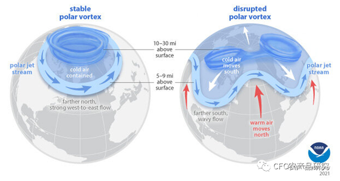 北极极地涡旋是平流层中的一个强大的风带,在距地面10-30英里的地方围绕着北极。当旋涡减弱、转移或瓦解时,这种剧变常常导致中纬度冷空气的爆发。这个剧变的影响机制是涡旋减弱后,西风带上出现大的起伏波动,进而暖空气就会趁机北上,暖空气的上行会将极涡分割成若干个冷中心,进而极寒的冷空气会向中纬度地区传递,寒潮天气随之到来。