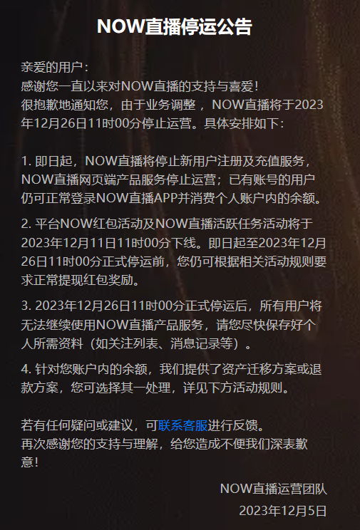 公告称,正式停运后,所有用户将无法继续使用NOW直播产品服务。