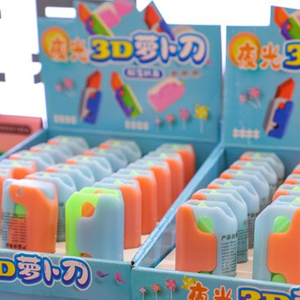 结束“挣扎”的“问号”再看看市场,“萝卜刀”的变种已超乎他想象——指尖微动,手腕下垂,一套标准动作之后,刀鞘里弹出的不再是“刀刃”,而是各种卡通人物。“夜光‘萝卜刀’”“‘萝卜刀’打火机”“巨型‘萝卜刀’”诞生,“萝卜金刚狼”“萝卜爪刀”“萝卜奥特曼”也粉墨登场。一些其他品种的玩具“蹭”上“萝卜刀”的配色,也试图挤进“萝卜家族”。